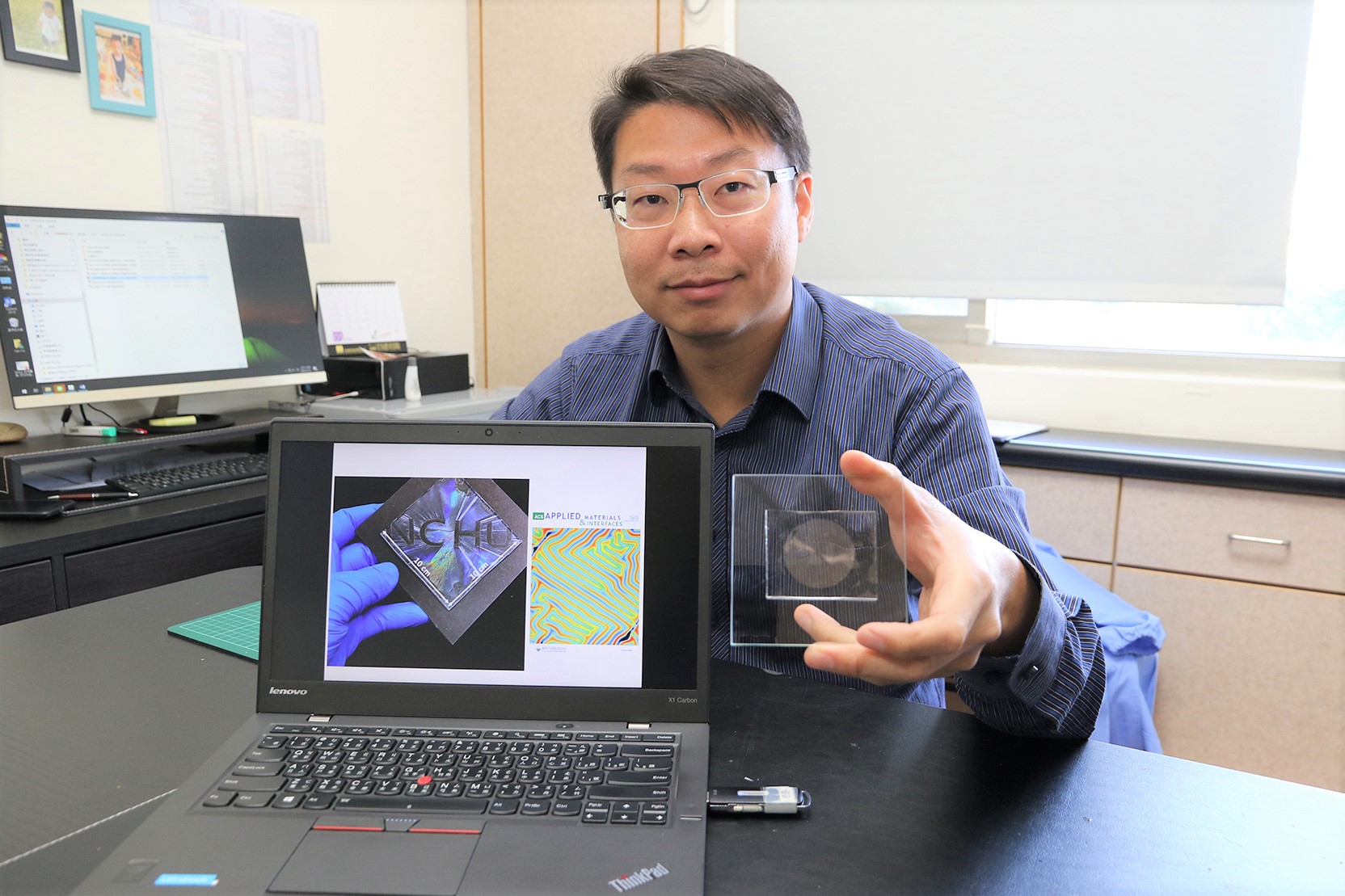 他表示,現階段製備微米級表面溝槽結構的方法很多,如微機電製程,但多半需要昂貴的高真空環境與設備,相對耗時且無法製備大範圍皺褶型態,不利於工業化應用。此外,用微機電製程所得到的溝槽,其溝槽形貌為長方體,尖銳的邊角容易在多次使用下變形毀損。而其所開發的製程,可得到如波浪般圓潤且低深寬比的皺褶型態,此型態可承受多次使用而不易毀損,更重要的,自發生成的類同心圓之回字形皺褶排整,與靈長類指紋相似,這是其他製程很難得到的表面型態。實驗結果也證明,回字形皺褶排整的確有助於表面黏著特性的增強,具備全角度的黏著行為而無死角,該研究已刊登於美國化學學會應用材料與界面期刊(ACS Applied Materials & Interfaces),並獲選為當期補充封面故事。